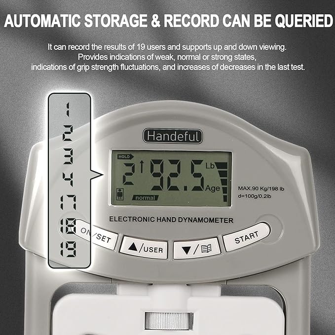 - [LCD Display] - Large LCD screen shows all measurements clearly on the same screen. Displayed measurements include user code, age, gender, grip value in pound or kg, and grip status. A maximum grip value display and weak, normal or strong power levels can be saved and easily recalled for comparison.