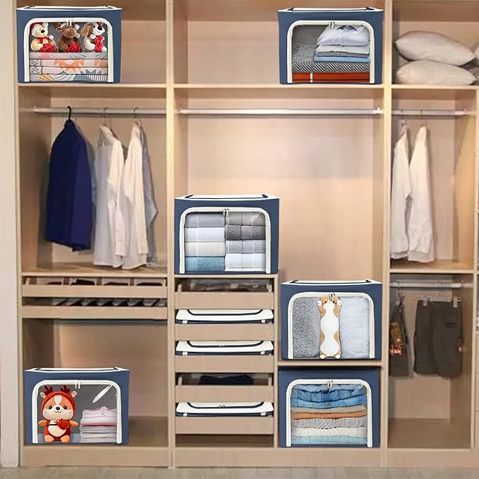 Clothes Storage Box Bins Stackable Foldable Organizer,Sturdy Handles with Metal Frame for Clothing Bedding Shelves,Closet Container with Clear Window Zipper and Label Holder (Navy, 40L x3 Pack)