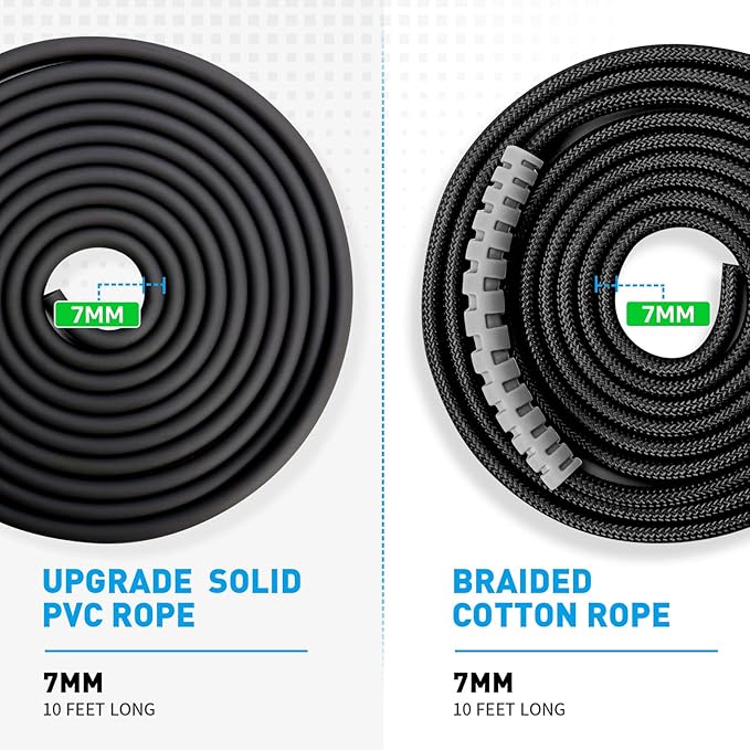 - We've added a wear-resistant silicone protective tube to our 7mm braided cotton rope, which weighs 0.2LB and is 10 feet long. And if you need a more wear-resistant option, our 7mm solid PVC rope weighs 0.28LB and is also 10 feet long. Both options require a perfect combination of speed and strength when using.