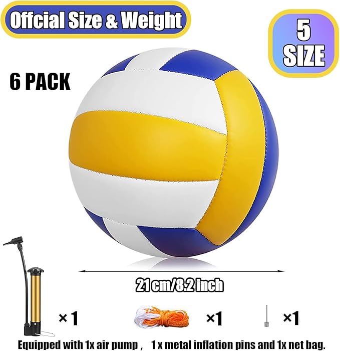 - 【What You Will Get】Includes Six Pack Official Regulation Size 5 Composite Leather volleyballs. 1 pcs Premium Pump with 1pcs metal inflation pins to maintain optimum air pressure. Includes a mesh bag for easy carrying out.