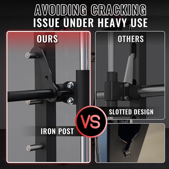 - [Fully Equipped & Varied] Equipped with multiple accessories, except the additional leg hold down attachment, t-bar row platform with t-bar, battle rope anchor. It also includes 4 free handle attachments, 2 (safety spotter arms, dip attachments, j-hooks), footboard, pull-up bar, etc.