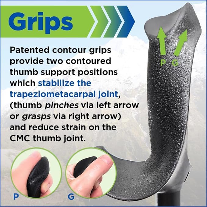- ULTRA LIGHTWEIGHT: Pairs are high quality aircraft grade 7075 aluminum with tungsten steel tip. Light and more stable than carbon fiber. Provides better stability when walking or hiking. Each pole only weighs 9.5 ounces (11 ounces with optional round rubber tip)! The patented contoured grips provide two contoured thumb support positions which stabilize the trapeziometacarpal joint. (thumb pinches via left arrow or grasps via right arrow) and reduce strain on CMC thumb joint.