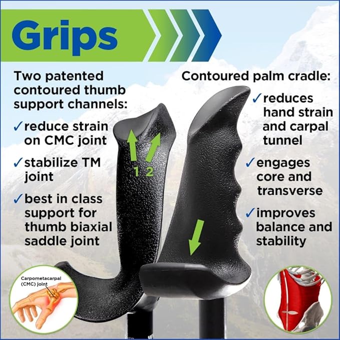 - ULTRA LIGHTWEIGHT: Pairs are high quality aircraft grade 7075 aluminum with tungsten steel tip. Light and more stable than carbon fiber. Provides better stability when walking or hiking. Each pole only weighs 9.5 ounces (11 ounces with optional round rubber tip)! The patented contoured grips provide two contoured thumb support positions which stabilize the trapeziometacarpal joint. (thumb pinches via left arrow or grasps via right arrow) and reduce strain on CMC thumb joint.