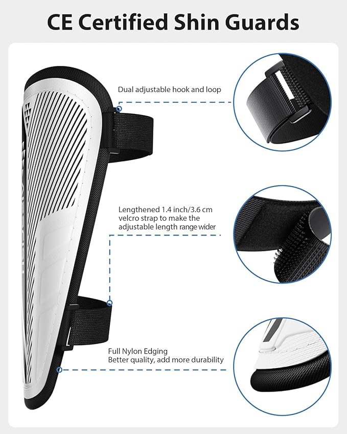 - CE Certified Shin Guards: Professional designed for kids/ youth soccer player protection for training or matches, certified by CE. Strong PP shell combined with high resilience EVA cushion has a high impact resistance performance to help against the high impact force in the soccer game. (Patent Pending)