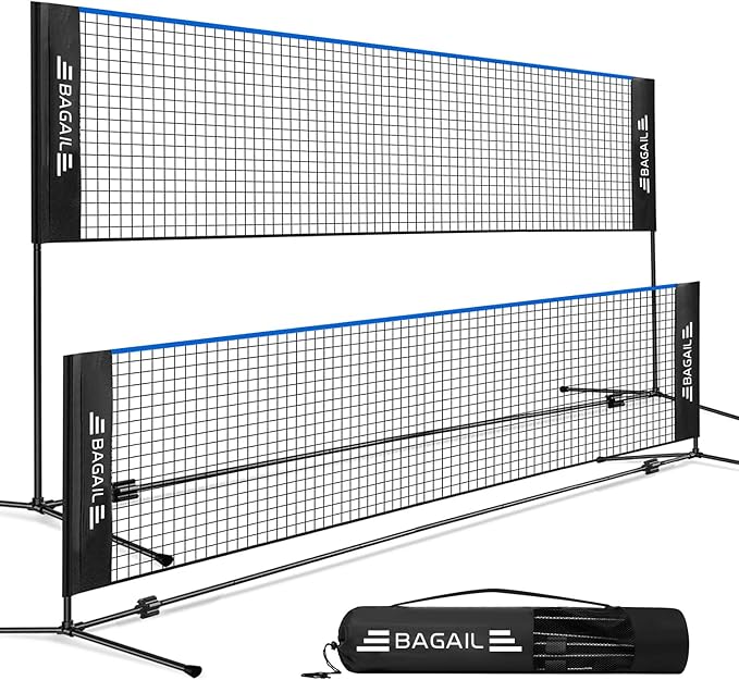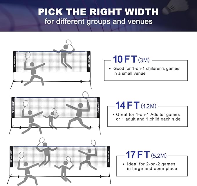 - Multipurpose Sports Net: Comes in 3 width options for you to choose from: 10 FT, 14 FT or 17 FT. Each net is height adjustable from 2.79' to 5.1' /85 cm to 155 cm. BAGAIL portable sports net is an ideal badminton net, junior tennis net, mini pickleball net or kids/pool volleyball net, in the yard, on the beach or any flat area