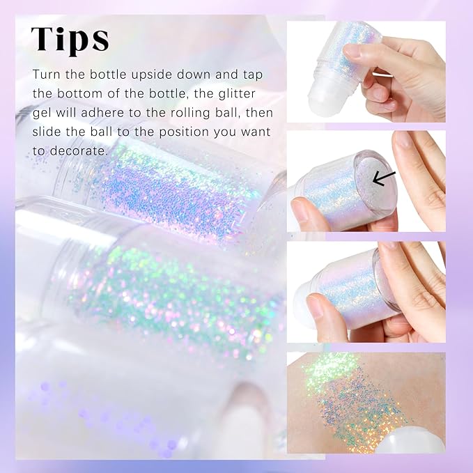 - Roll On Body Glitter Gel: Our body glitter is convenient for using, roll-on design can make the glitter apply evenly to your face and body. When the ball rolling on your skin, you will feel comfortable and great touch, give you good experience without using hands