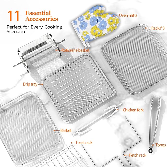 - Non-Toxic Design: All accessories are dishwasher-safe and free from harmful coatings, PFAS, PFOA, Teflon, and BPA. You will receive 11 accessories: a rotating basket, deep basket, drip tray, fetch rack, 3 dehydrating racks, chicken fork, toast rack, tongs, and two oven mitts.