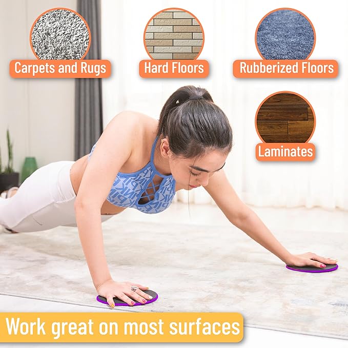 - Designed for versatility, the sliders are equipped with a shock-resistant plastic side for use on soft surfaces like carpet, and a soft fabric side for hard surfaces, with curved edges to minimize chafing on palms and fingers.