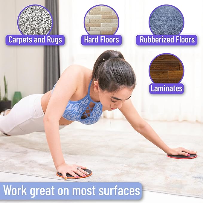 - Designed for versatility, the sliders are equipped with a shock-resistant plastic side for use on soft surfaces like carpet, and a soft fabric side for hard surfaces, with curved edges to minimize chafing on palms and fingers.