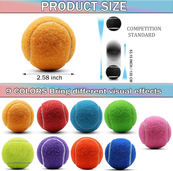 - 【Value Package】You will get 20 pcs tennis ball and comes with a reusable mesh bag.Easy transport and storage.10 different prevalent colours for your choice ,make your pet enjoying catching and running.
