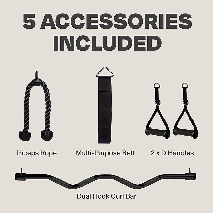 - Includes essential accessories: Comes with (2) D-handles, a dual hook curl bar, a chin/dip belt, and a triceps rope for a complete workout experience.