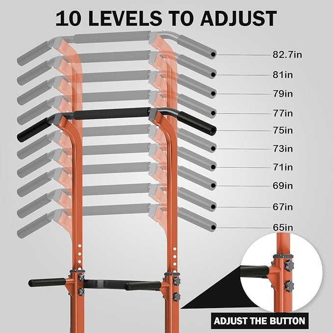 - 【10 Levels of Height Adjustment】The power tower has 10 adjustable height ranges from 65" to 82.7". The lowest level is designed for children and the power tower is suitable for the whole family workout. Its convenient for different age, shapes and sizes. A variety of height options make it ideal for exercise for the whole family.