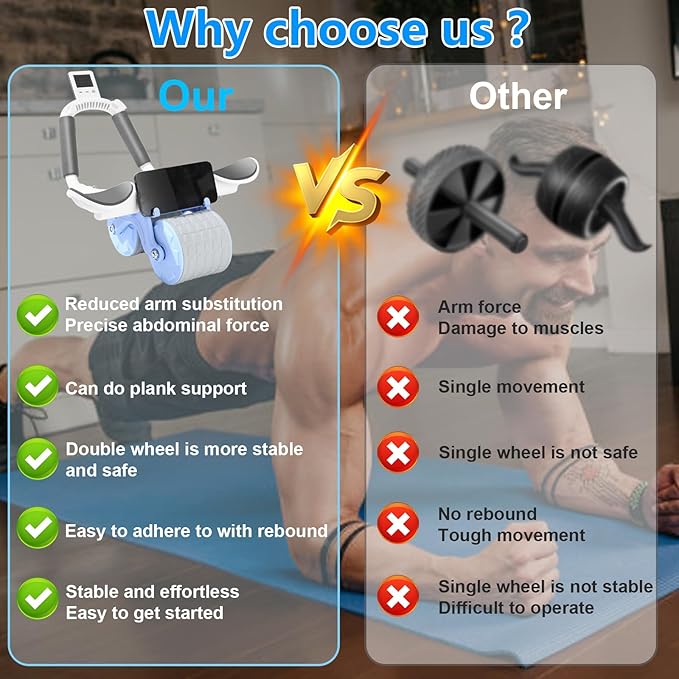 - 【DOUBLE WHEEL DESIGN】This exercise abs roller has a wider front and back two wheels for smooth rolling and better control. It helps you work out every muscle and in your core and at the same time provides safer control of your body, especially for beginners.