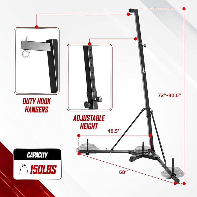 - ADJUSTABLE HEIGHT: Heavy bag corner stand adjusts from 72 to 90.6 inches to meet your personal needs; Experience the optimal Muay Thai bag stand or heavy bag with stand training with this uniquely freestanding boxing bag with stand.