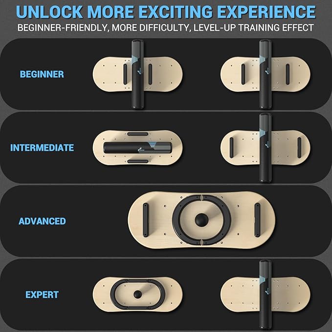 - 2-in-1 Versatile Set: Each set comes with 1 balance board, 1 roller and 1 ball that provides 7 unique challenge modes, allowing you to progressively work your way up to improve your strength and balance. Plus, the 4 individual magnetic removable stoppers ensure smooth switch between modes and convenient disassembling.