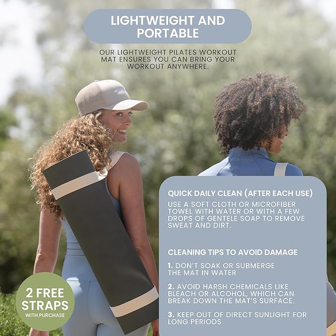 - EFFORTLESSLY PORTABLE: Our lightweight pilates workout mat ensures you can bring your workout anywhere. Included with your purchase are 2 storage straps, making transport and storage a breeze, for fitness that follows you