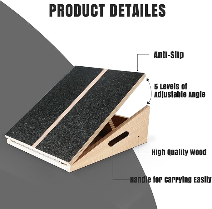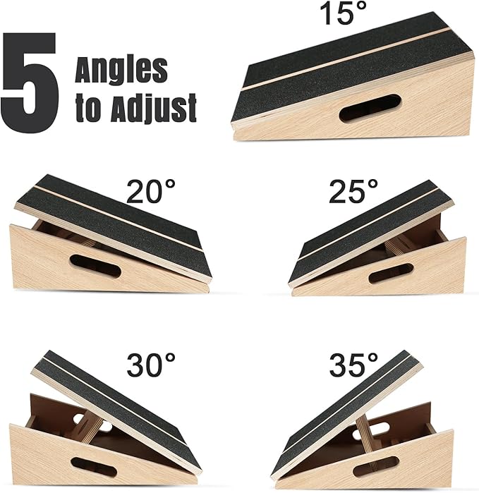 - Adjustable Slant Board - Calf stretch board featured with quick-adjust locking system between five adjustable positions: 15°, 20°, 25°, 30° and 35°.Ergonomic design, can play a good stretching effect, so that your muscles are more responsive in the exercise. Angle control system allows you to adjust more easily to meet your different exercise needs.