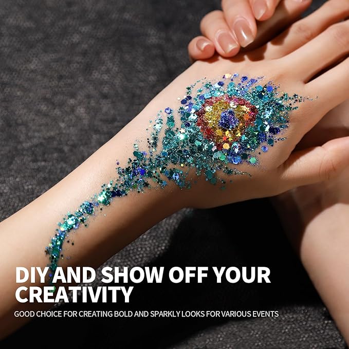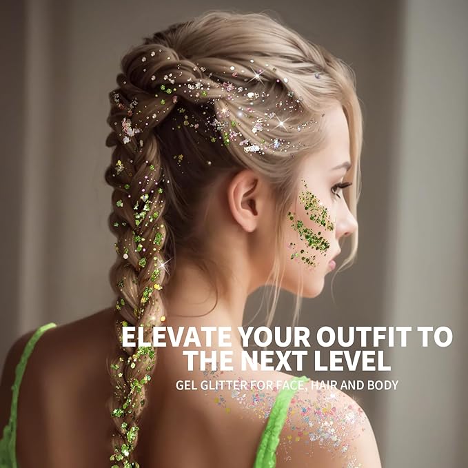 - GEL GLITTER FOR FACE, HAIR AND BODY - Perfect for concerts, parties, and festivals! If you are going to a music concert or a nice, romantic dinner, adding some glitter to your beautiful body can elevate your outfit to the next level. What’s more, you can include it in your daily makeup, office wear, or as part of your favorite look on Halloween. You can also use body glitter for nail art and crafts, if you're handy