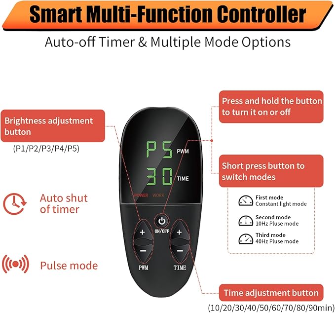 - 5 Levels Brightness Adjustment: The temperature changes when the intensity is adjusted. The higher the intensity, the higher the temperature.