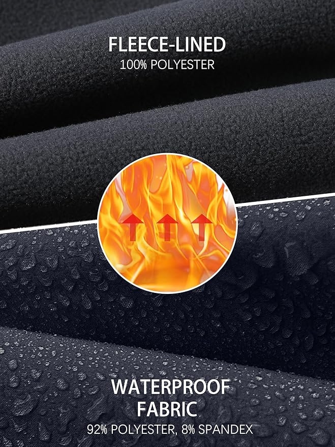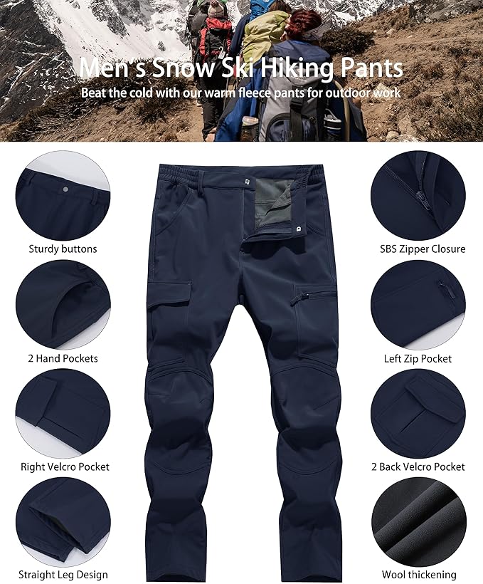 • Men's hiking snow skiing pants are made of 92 % polyester and 8 % spandex, and fleece-lined pants are windproof, waterproof, warm, and comfortable, providing better flexibility even in cold winters.