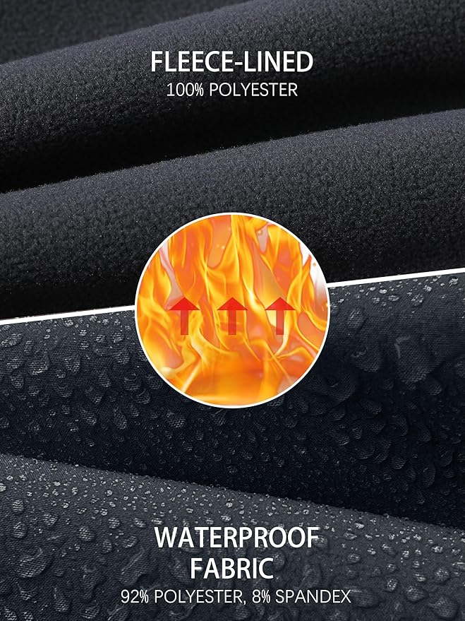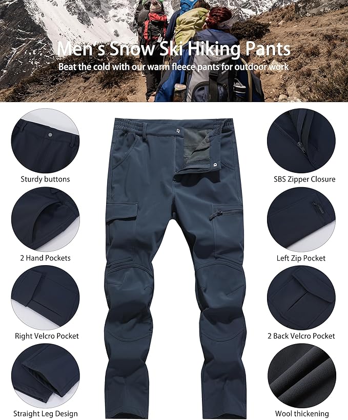• Men's hiking snow skiing pants are made of 92 % polyester and 8 % spandex, and fleece-lined pants are windproof, waterproof, warm, and comfortable, providing better flexibility even in cold winters.