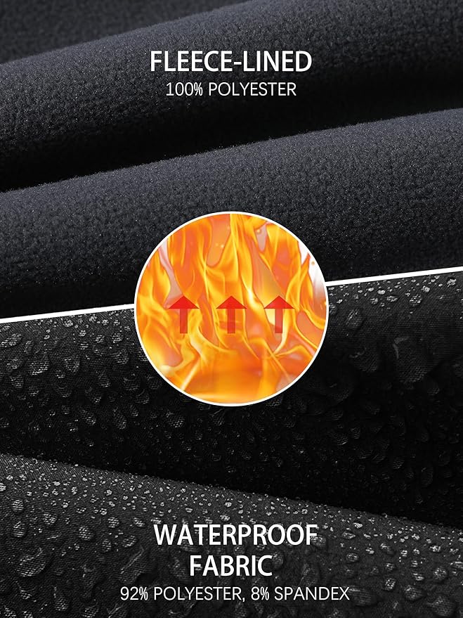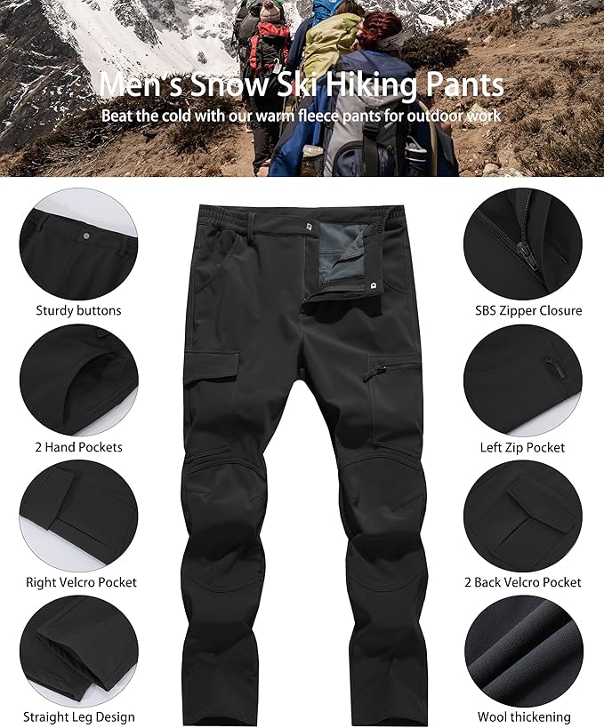 - Men's hiking snow skiing pants are made of 92 % polyester and 8 % spandex, and fleece-lined pants are windproof, waterproof, warm, and comfortable, providing better flexibility even in cold winters.