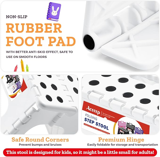 ACSTEP 7.5 Inch Folding Step Stool Foldable Stool Height Kids Step Stool, 176 lb Capacity Plastic Collapsible Stool, White Small Stepping Stools, Foot Stools Suitable for Kitchen