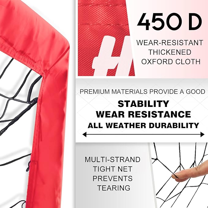 - 【Long-lasting Thickened Material】 The soccer goal is made of 450D thickened oxford cloth, 10mm high elastic fiberglass pole and strong 3-layer polyester soccer net. This ensures exceptional performance even against powerful shots, maintaining its all-weather durability and it won't fade or wear even if it is placed outdoor for a long time.