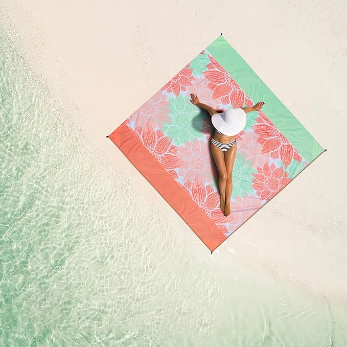 - 🌴【Sand proof & Water resistant】This quick-drying, durable travel blanket are made of nylon. You can just shake the beach mat to remove sand or other debris. The sand pad has 4 pockets at each corner, so you can fix it on the beach by filling the side pockets with stone, sand, or using the included anchor.