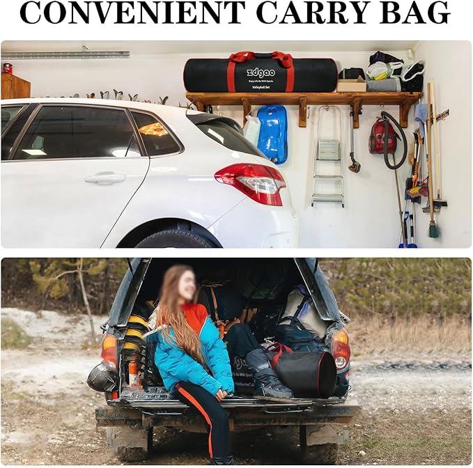 - Completed Volleyball Set: 6 *lightweight poles, 1* high end wrap yarn volleyball, 1* volleyball net in official size, 1* ball pump with needle, 2* guide ropes with 4* safety stakes, 1* boundary line, 1* spool of boundary line, and 1*Portable storage bag with handles.