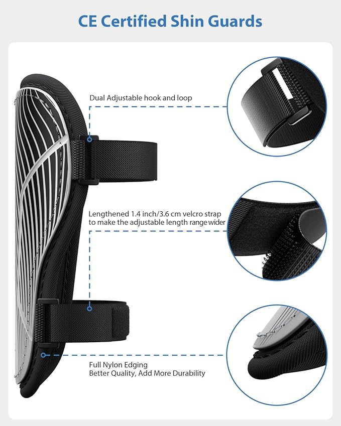 - CE Certified Shin Guards: Professional designed for kids/ youth soccer player protection for training or matches, certified by CE. Strong PP shell combined with high resilience EVA cushion has a high impact resistance performance to help against the high impact force in the soccer game. (NOTE: The shin guard DOES NOT cover the whole lower leg.) (Patent Pending)
