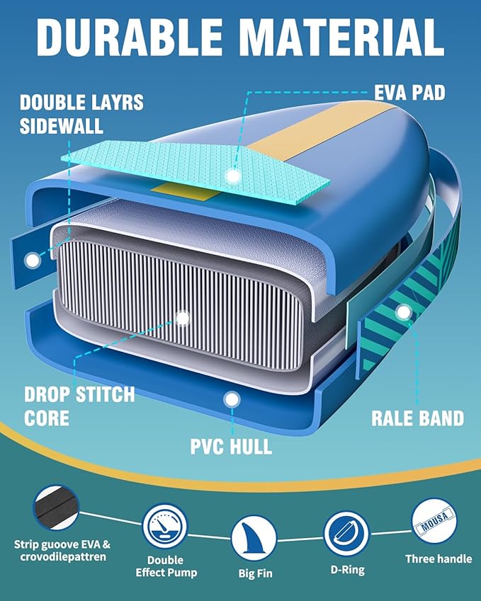 - RESISTANT & DURABLE MATERIAL >>> With 20 years of industry experience, we use trustworthy materials and double drop stitch core to improve wear resistance and durability by 30%. Double layers of rail are applied to reinforce this stand-up Sup inflatable cruiser.