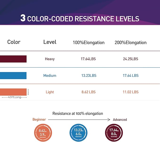 - 【Fun & Easy To Use】 The Bands are Perfect for Resistance Training and Rehabilitation, Which Provides Both Positive and Negative Force. You Can Take a Couple Wraps Around Your Hands for More Tension and a Secure Grip. or Just Tie a Knot, For Use as a Loop Band, and also You Can Double Them Up for Even More Resistance. The Bands are Vibrantly Color-Coded, Once You are Ready for a More Challenging workout, You can Move Up to The Next Color.