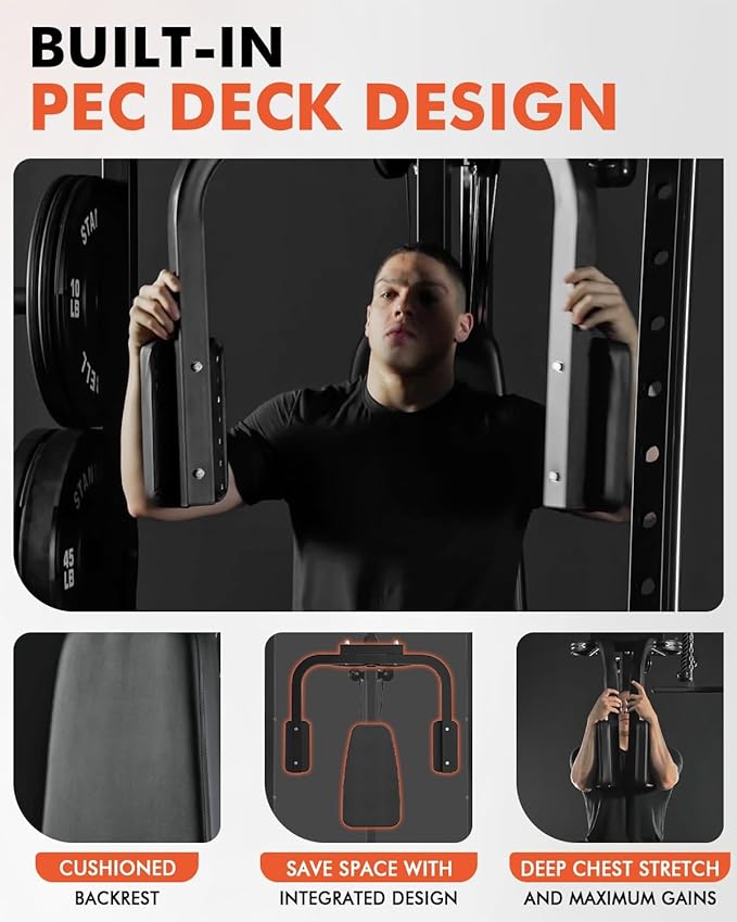 - [Ergonomic Pec Deck Station] Train your chest with comfort and precision. The built-in pec deck offers a fixed range of motion with thick, durable padding — promoting isolated pec activation while minimizing shoulder strain. Ideal for both strength building and rehab training.