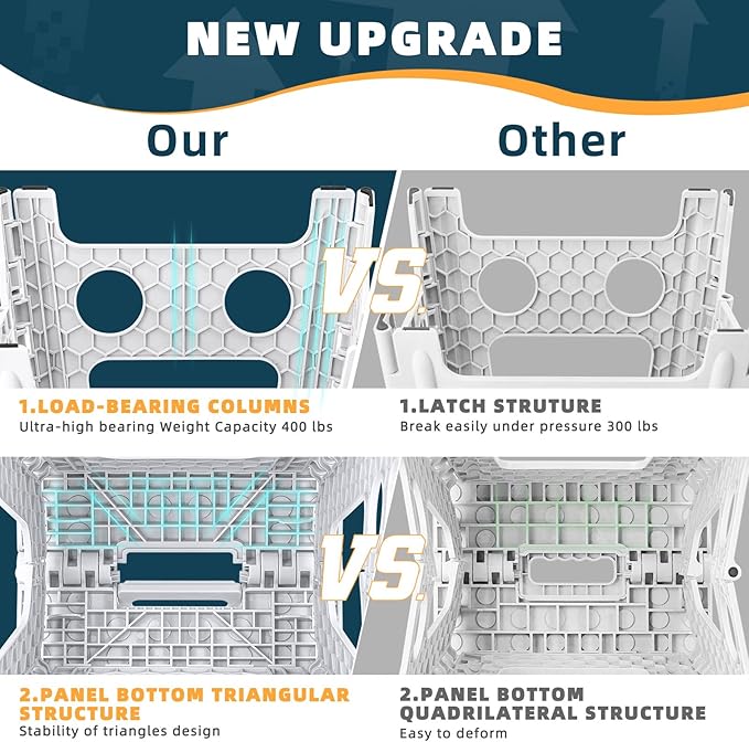 - Loads Up to 400lbs: ACSTEP pin structure stool is patented. Folding step stool has been reinforced with locking pins and fixed hinges to prevent danger of falling off and enhance stability and bearing capacity effectively. Inner honeycomb structure is uniquely designed in such a way that makes the stool extra strong and safe. Tested to hold up to 400 LBS, this folding stool offers great stability even when loaded.