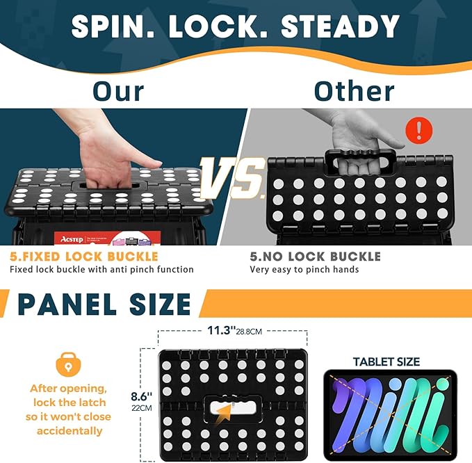 - Space Save Step Stools: ACSTEP foldable stool with handle. Just lift the handle and it will fold up easily and quickly in a few seconds. Lightweight and collapsable, easy to store in corners of bathrooms, kitchens, bedrooms, etc. to keep your home organized, free to go with the slit storage, not occupying space.
