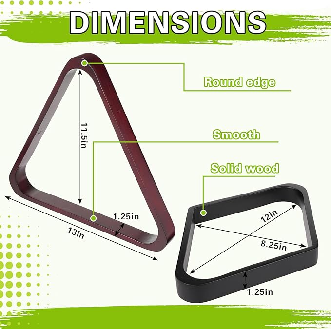 - Proper Size Compatibility: the triangle rack measures approx. 13" x 11.5" x 1.25", while the diamond rack dimensions are approx. 12" x 8.25" x 1.25", ensuring a reliable fit for standard 2-1/4” size billiard balls; Each billiard ball in this set measures approx. (2-1/4") 57mm in diameter, meeting most standard specifications for gameplay