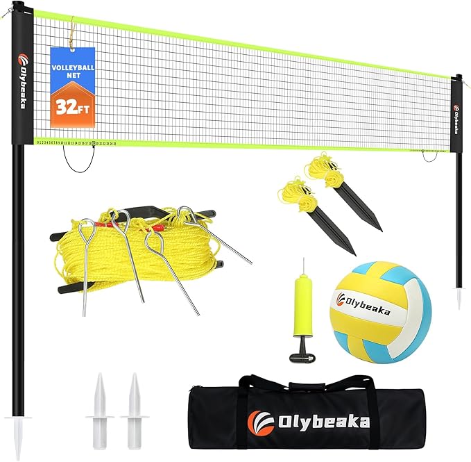 - 𝐀𝐥𝐥-𝐈𝐧-𝐎𝐧𝐞 𝐊𝐢𝐭 → 𝐍𝐨 𝐄𝐱𝐭𝐫𝐚 𝐁𝐮𝐲𝐬:Get EVERYTHING for a full game, no extra spending! Set includes: 32ft tough net + adjustable snap-on poles + soft PU volleyball (rubber core, no hand pain) + dual-needle air pump + boundary line (ONLY 32FT INCLUDE) + upgraded ground stakes + 600D wear-resistant carry bag. setup→play→storage—no need to buy extra parts!