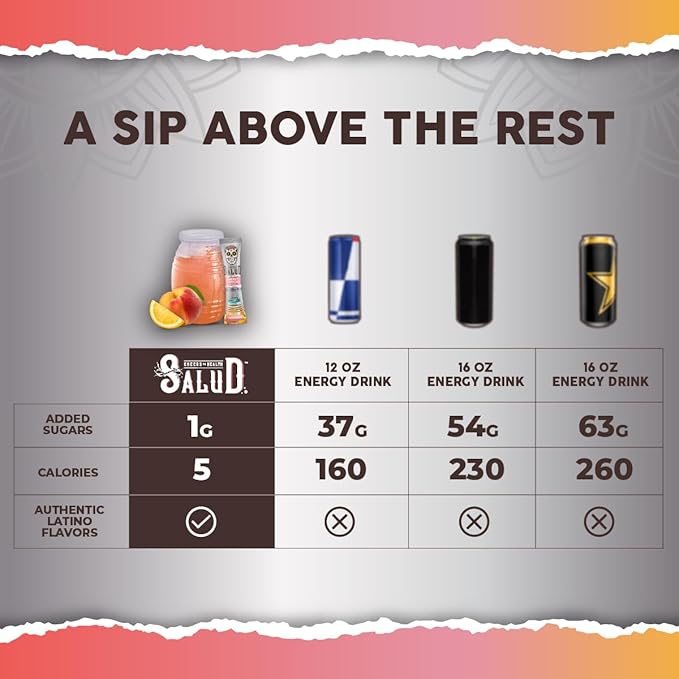 - US vs THEM - Unlike traditional energy drinks loaded with sugars, Salud will turn plain water into a mouth-watering Agua Fresca drink with only 1g of added sugar and 5 calories per serving. You can feel good about starting your mornings and workouts with Salud!