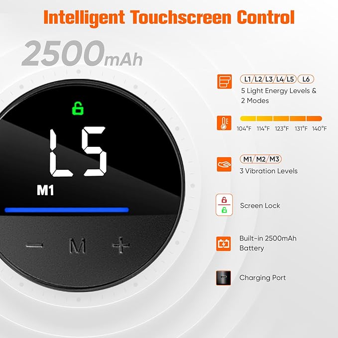 - Intelligent Touchscreen Control: Effortlessly customize your therapy with Intelligent Touchscreen Control. Adjust 3 vibration levels, 5 red light modes, and a 10Hz pulse mode.