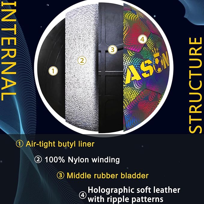 - ⚽SPECTACULAR HOLOGRAPHIC REFLECTIVE SOCCER BALL -- When light shines on the ball, new generation reflective PU leather provides the soccer ball with a shiny, holographic reflective glowing surface, captivating soccer fans. Photos or videos with your flash-on camera will get the perfect holographic effect