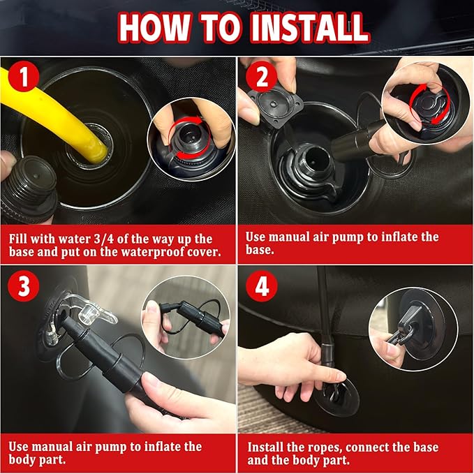 - Easy to Install: First fill the base of the saco de boxeo para adultos with water, and fill it with air using a manual inflation pump. Then fill the main body of the inflatable punching bag with air, and finally fasten the four ropes. Be careful not to inflate too much, wear matching boxing gloves to start your boxing training.