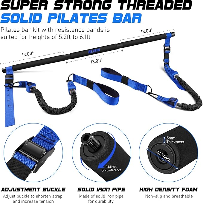 - ADVANCED THREADED PILATES BAR: Composed of 3 sections Φ1.37-inch solid steel rods, with 5mm Soft Nitrile Rubber pad (wear-resistant, sweat-absorbent, non-slip), and can perform stable and safe exercises even if sweat during exercise. Squat bar ends are equipped with adjustable straps with a heavy metal buckle cam that allows you to quickly and easily adjust the length required for various exercises and individual heights. This strong screwed solid squat bar can withstand 600lbs of resistance