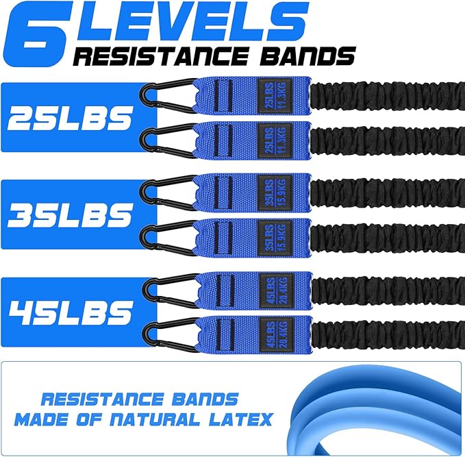 - 210LBS HEAVY RESISTANCE BANDS: 6 exercise bands, 2x25lb, 2x35lb, 2x45lb tubes, enabling up to 210lb resistance. Each resistance band is encased in a durable nylon sleeve, for maximum longevity and safety during use. Natural latex material with high elasticity and tear resistance, which can withstand intense daily exercise. Whether beginner or advanced, these exercise bands adapt to your strength level. Our pilates bar kit with resistance bands is suited for heights of 5.25' to 6.25'