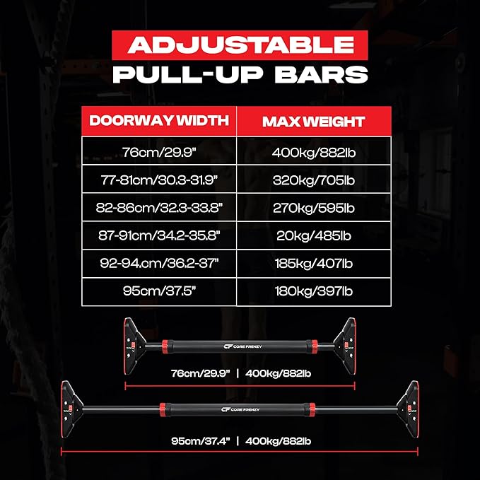 - 🔧 ADJUSTABLE & UNIVERSAL FIT: Designed to fit most door frames, the Core Frenzy Pull-Up Bar extends from a compact 29.9" to an extra-wide 37.5". Whether you're doing chin-ups or wide-grip pull-ups, this bar adjusts to your space—no tools or screws required.