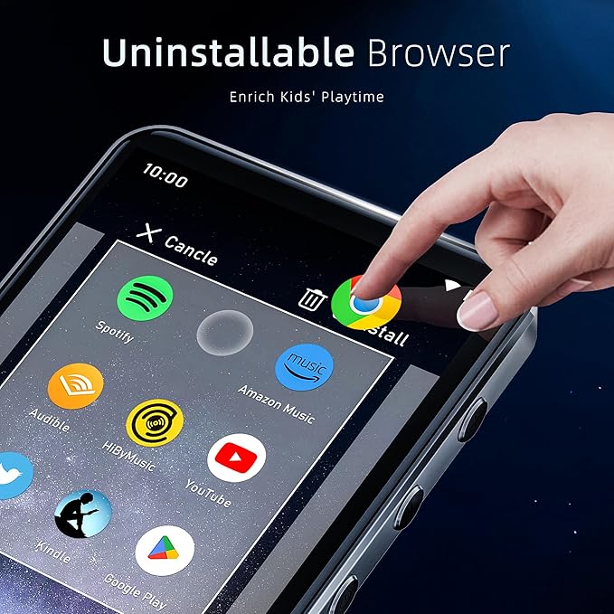 - 【Friendly MP3 Player】Bluetooth MP3 player offers the flexibility to install new apps and update existing ones to the latest version at any time. Its parental control feature ensures that children can only download apps with explicit authorization, providing a secure environment. Additionally, you can easily remove unnecessary apps to save memory and enhance device performance.