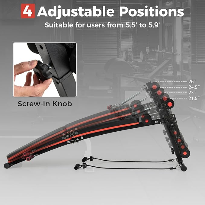 - All in One Workout Bench: With 4 level adjustable height from 21.5” to 26”, GYMAX sit up bench would fit your whole family and different workout intensity. Featuring 2 push up handles, 1 spring handle and 2 elastic ropes, this workout bench is also suitable for upper body exercise.