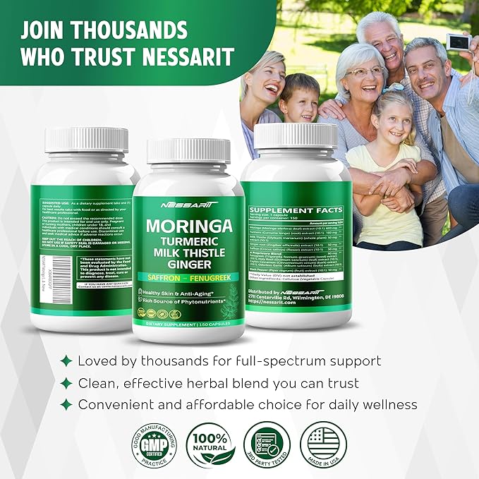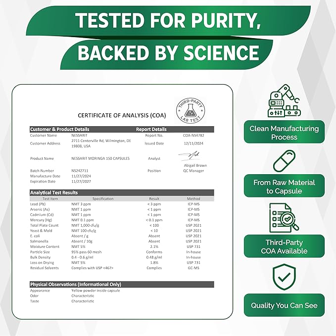 - High-Quality Ingredients: Nessarit's Moringa Supplement is crafted from meticulously tested ingredients, each verified for purity and effectiveness by third-party labs