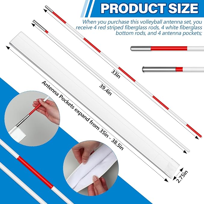 - Comprehensive Package: when you purchase this volleyball antenna set, you receive 4 red striped fiberglass rods, 4 white fiberglass bottom rods, and 4 antenna pockets; This total package ensures you won't have to buy parts separately, saving both time and energy