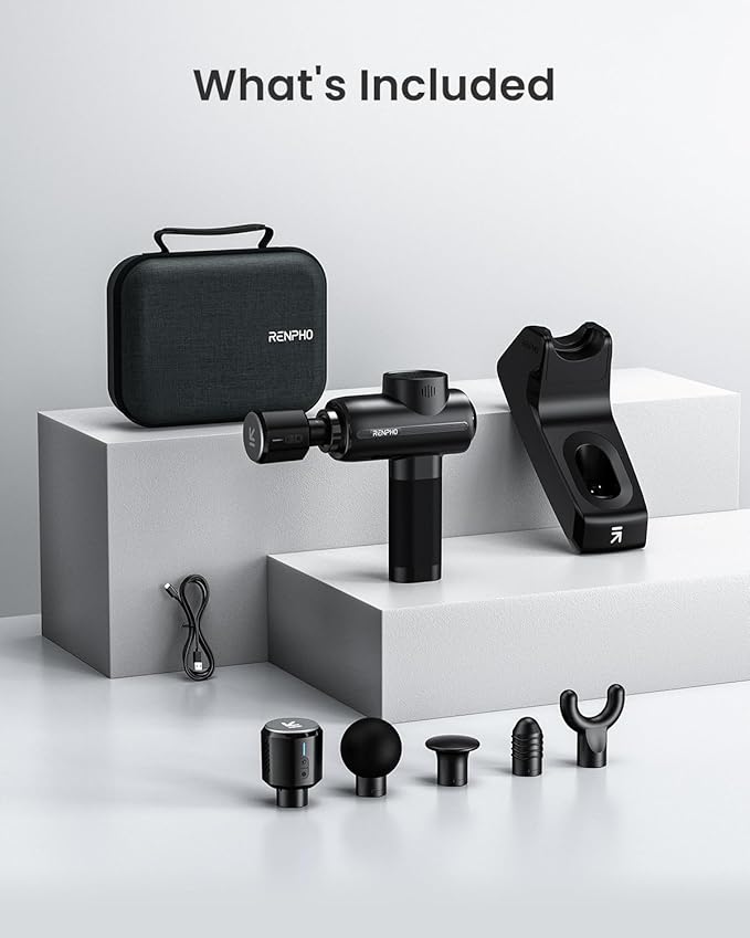 - Hot and Cold Therapy: Renpho Massager gun deep tissue with Heat comes with a heating and cooling massage head(No built-in battery) that can heat up to 113 °F (45 °C) or cool down to 47 °F(8 °C) for deeper muscle relaxation and stress relief